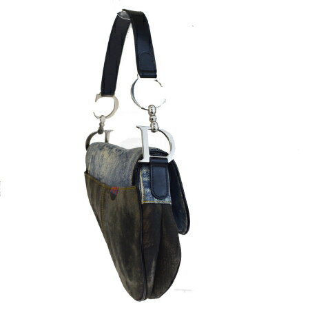 送料無料 【中古】 中美品 クリスチャンディオール Christian Dior サドルバッグ ショルダー デニム ブルー ブラック キャンバス レザー 74EQ675