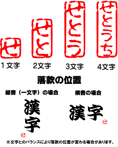 ・ひらがな1文字は200円 ・漢字1文字は300円 ・2文字以上は500円 オリジナル落款は四角枠に縦書となります。
